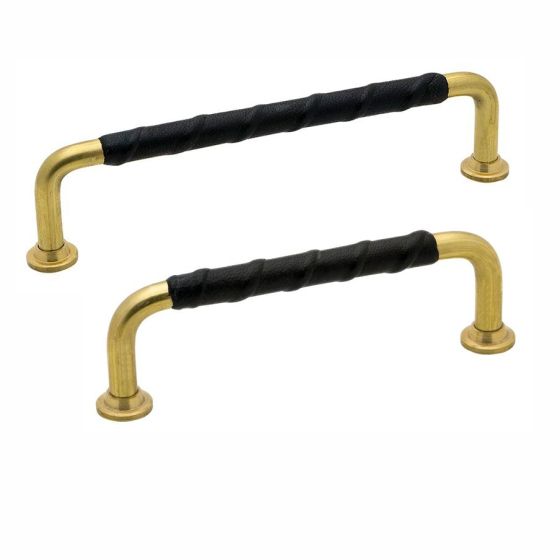 Perinteinen messingistä valmistettu vedin, jonka keskiosa on päällystetty nahalla. Beslag Design on käyttänyt tämän vetimen keskiosan päällystämisessä aitoa Ruotsin Tärnsjöstä saatavaa nahkaa.